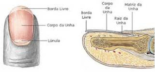 As unhas apresentam uma forma quadrilátera, são esbranquiçadas e possuem três partes distintas: